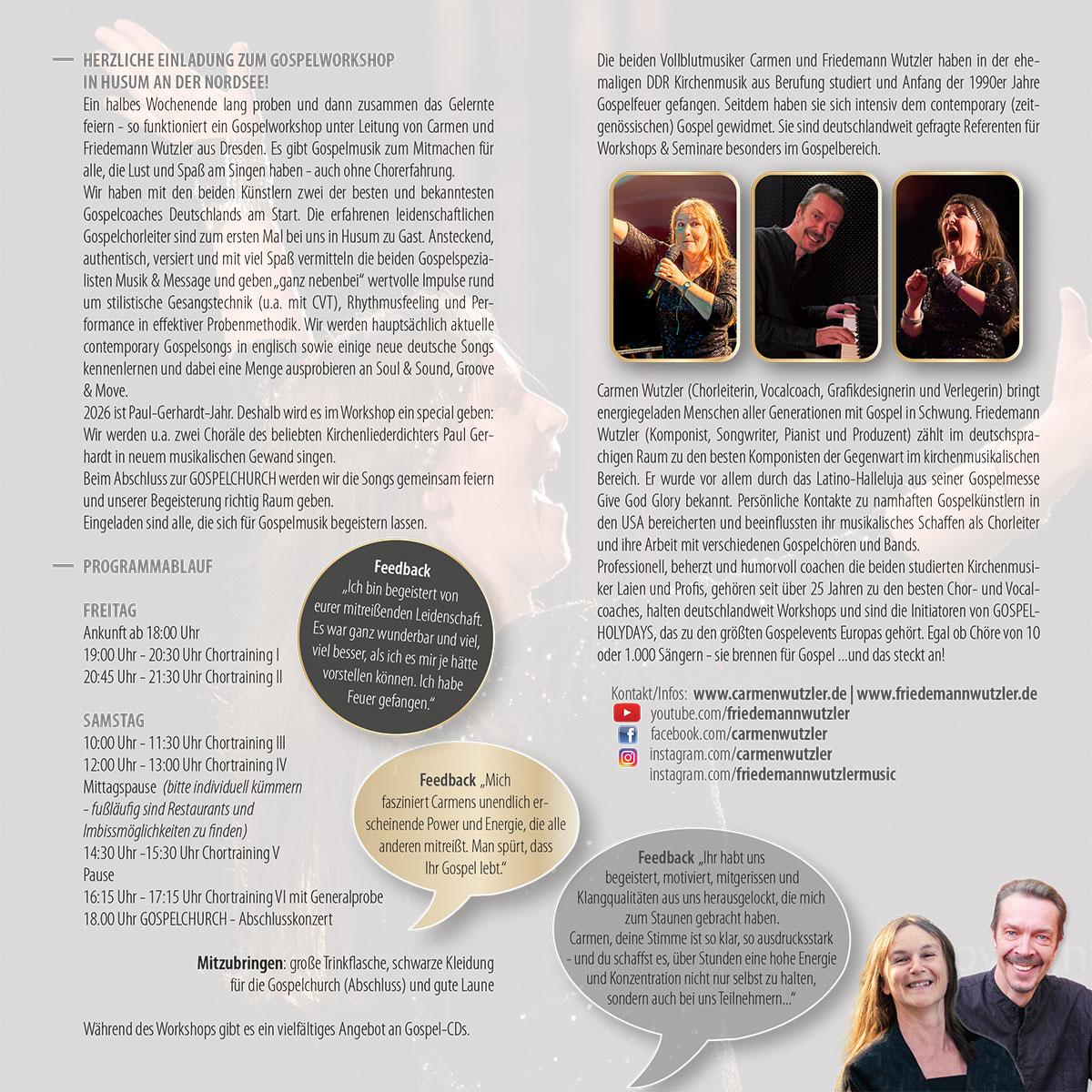 Im Workshop singen wir u.a. aus der Gospelmesse von Friedemann Wutzler. Solltest du diese Noten (grünes Songbook) bereits besitzen, so setze bitte ein Häkchen bei "ja" und bringe sie zum Workshop mit.